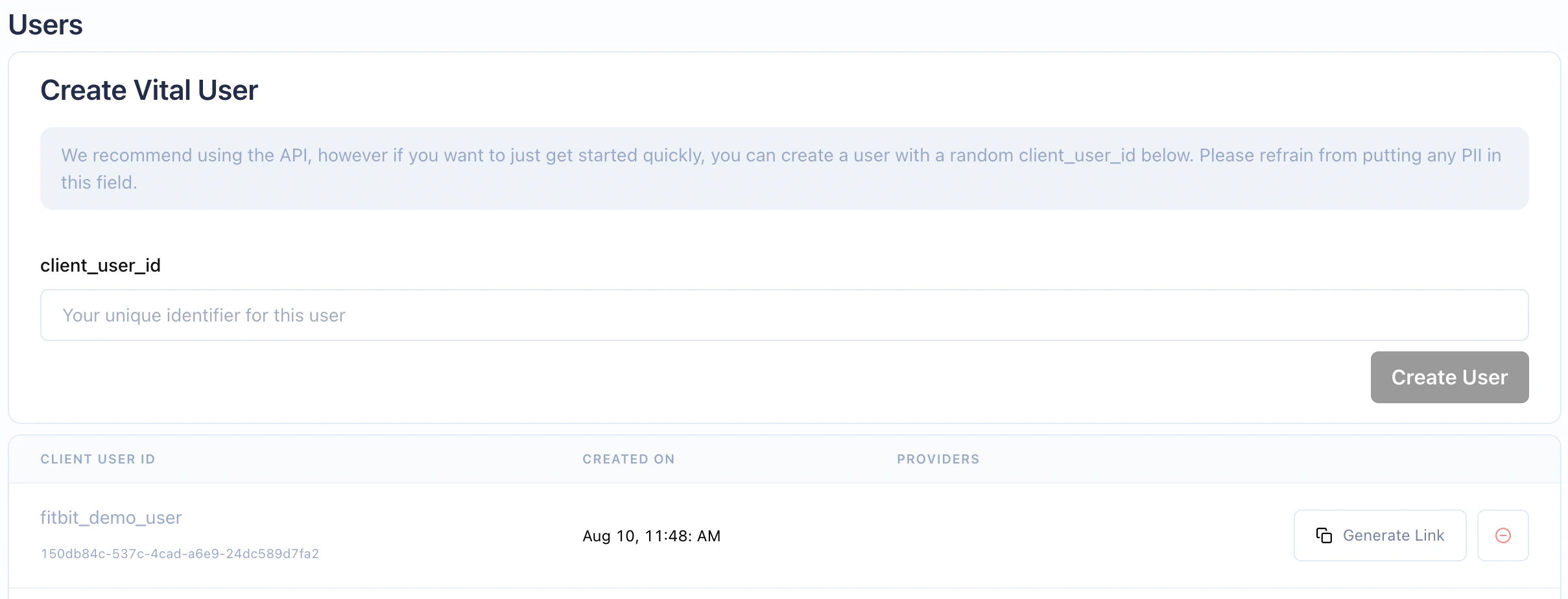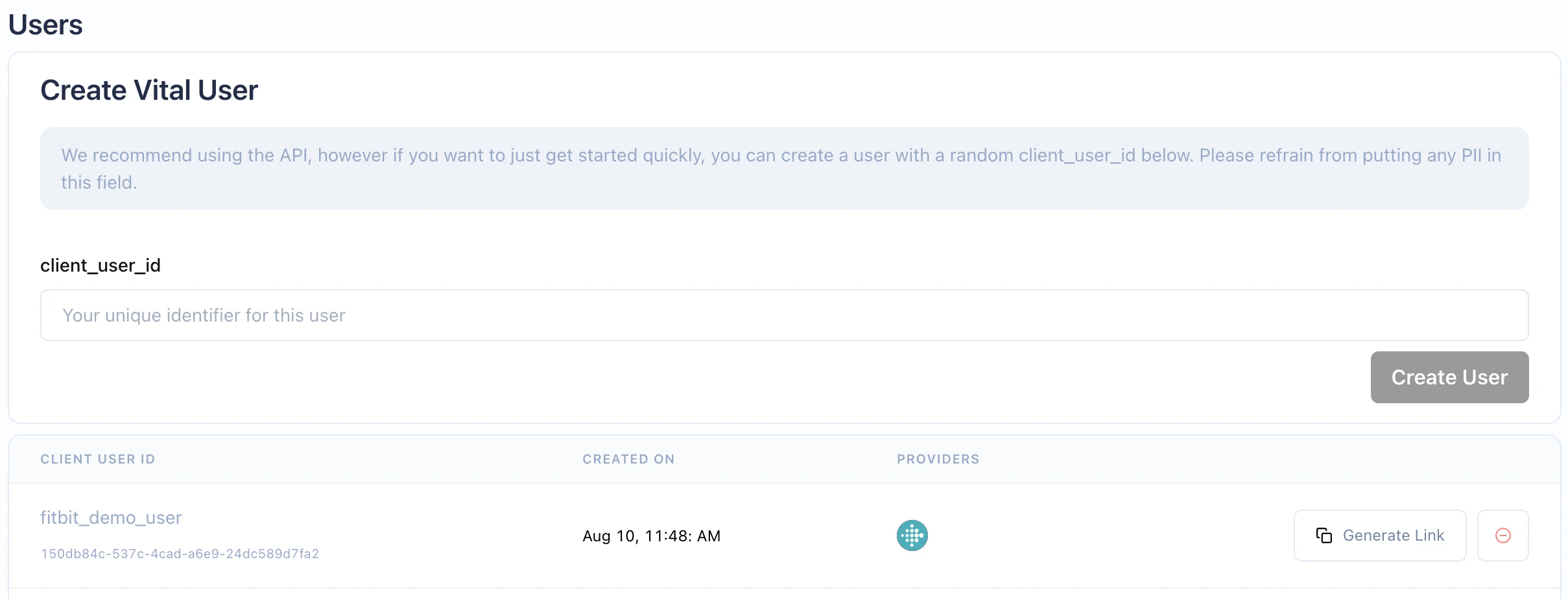 First, you need a Junction user. You can create one either through the dashboard or through the API. After creating the user, theUsers page of your dashboard will look like this: